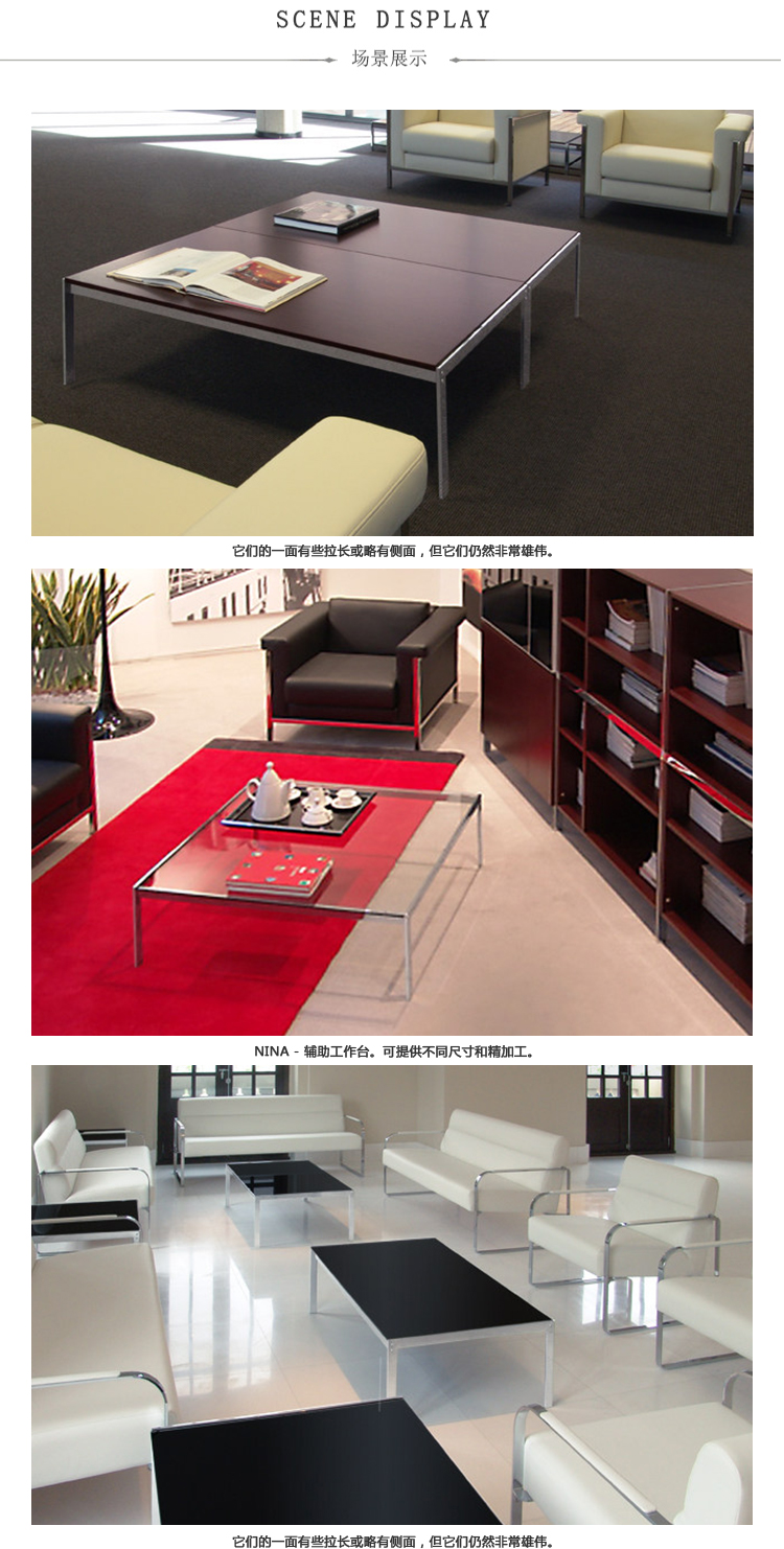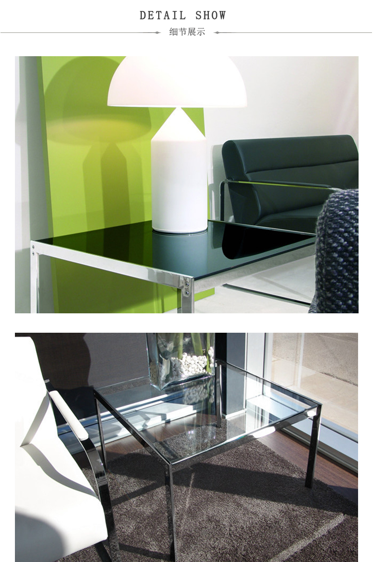 咖啡桌。10mm校准inox金属板框架。16毫米实木或8毫米玻璃顶。表面处理:金属框架采用光泽镀铬处理。WOOD顶部采用木质饰面或微纹理漆。玻璃顶部采用半透明玻璃或黑色漆面玻璃。