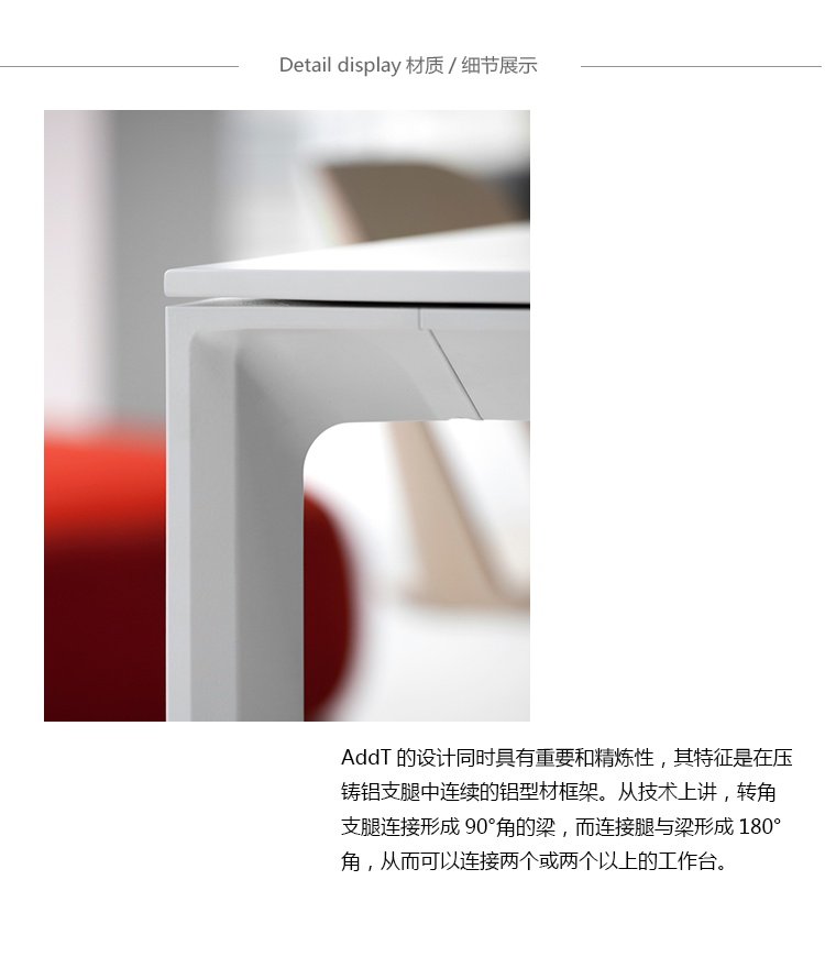 写作,阅读,以及当社区扩大,工作和会议。我们的需求会无限变化,AddT其设计具有重要和精炼性,满足任何环境的要求。它的轻盈和伟大的特点,闪耀着生命和完全适应性的增加座位系统。由于它的压铸铝腿,创造了一个单一的角落解决方案或扩大的框架,可以创造多种成分这使得非常适合于食品服务、办公室、隔离区和一般酒店市场。电缆运行,隐藏和固定在剖面下,插座和电源适配器插入桌面。在平静的一天里,所有的东西都是用户友好的。