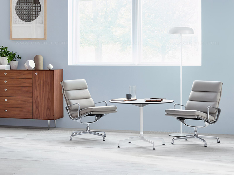 Charles与RayEames夫妇是20世纪最有影响力的设计师,卓越的设计涵盖了家具、建筑、影像与平面设计。他们从二次世界大战中美国海军的实验计画中学习经验并发展可谓是现今工业中使用模铸胶合版的先锋,这对设计界的超级夫妇档自1940年参与了由MOMA举办的有机家具设计大赛,自今已有近百件他们的作品被各大博物馆所永久典藏。Eames® Soft Pad Executive Chair(伊姆斯软包大班椅)是夫妻俩1958年设计的,是在全铝系列的基础上发展的另一系列Eames产品。舒适系列在全铝的椅架上增加了皮革制的柔软坐垫和靠背,高级铝合金制作,压模五星脚,可旋转。背垫和坐垫,采用西皮,具有透气性强,内部填充高密度定型绵,不易变形,不老化,依人体坐姿,符合人体工学,耐水及对人体无害等优势。椅子扶手选用优质电镀铝合金扶手,手感舒适,永久不生锈。转椅底盘为多功能底盘,可以保护使用者长时间坐用腿部健康,且作为高度可多定位调节。气压棒采用的气杆是正规厂家出产的外贸气杆,每一根气杆都有钢印,经过严格SGS检测的才可出厂,旋转、升降自如基本无声响,使用寿命长,可承受250kg,可升降数万次,将椅面调至与膝盖同高时,使用者坐下后双脚跟可垂直平放于地上,且大腿与地面平行,最符合人体工学理论,使用者长期久坐,也不想疲惫。办公椅脚为铝合金材质永久不生锈、承受能力强,安全更放心。椅子脚轮采用优质电镀片脚轮,耐用而美观,可以随意变换位置,贴心更方便,具有防震及防松脱,让椅子的安全性能更加可靠。