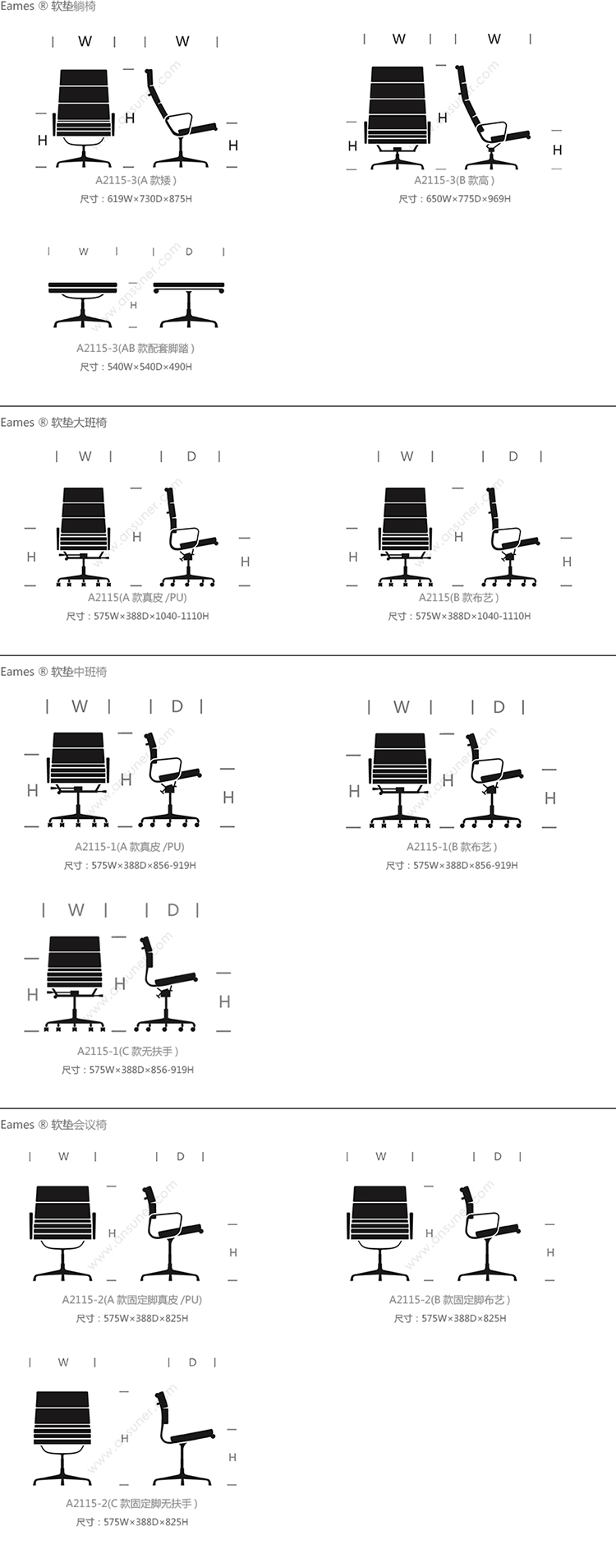 Eames®软垫躺椅 系列尺寸/示意图