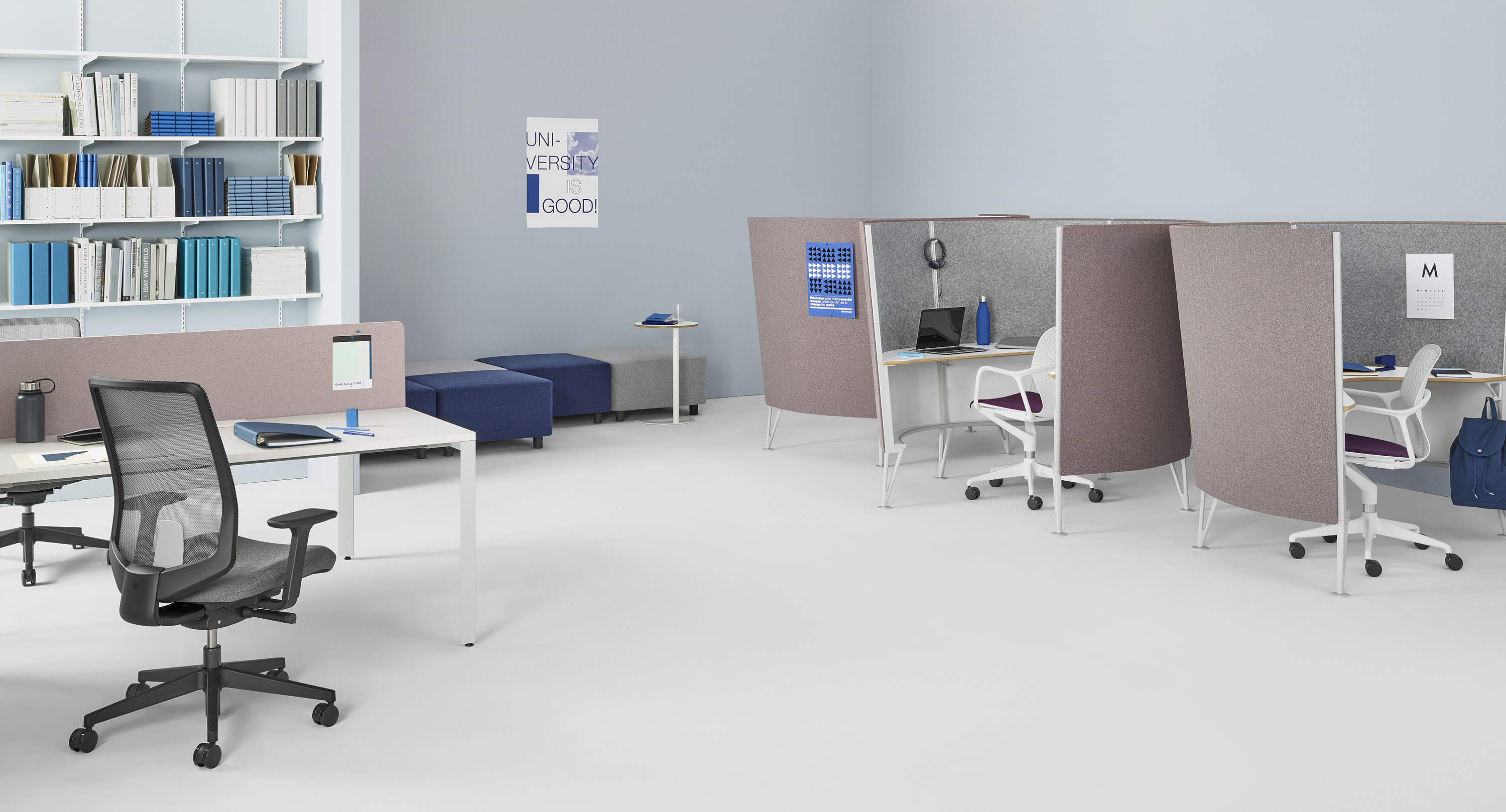 To bring their best thinking to their teams, people need time for focused work and contemplation. Prospect Solo Spaces are ideal for individual creative work or simply a place to settle in and tackle a few quick tasks. The round shape offers visual privacy—unique within an open floorplan—and the soft, sound-absorbing materials create a peaceful spot for working or studying.