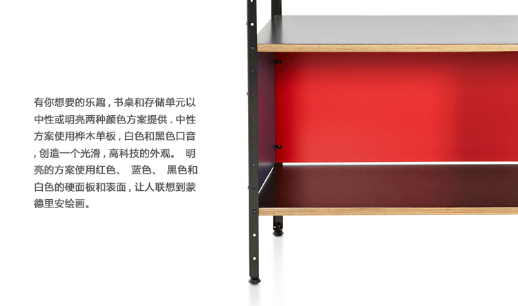 Eames存储单元由五种配置和四种大小的箱子、橱柜和抽屉组成。立柱、交叉支撑板和穿孔板要么是镀锌的,要么是黑色的;橱柜的正面是凹凸不平的胶合板;抽屉的正面和架子是模制的胶合板;箱体侧面和背面的面板是涂硬木的。可供您选择两种配色方案:中性色或亮色。