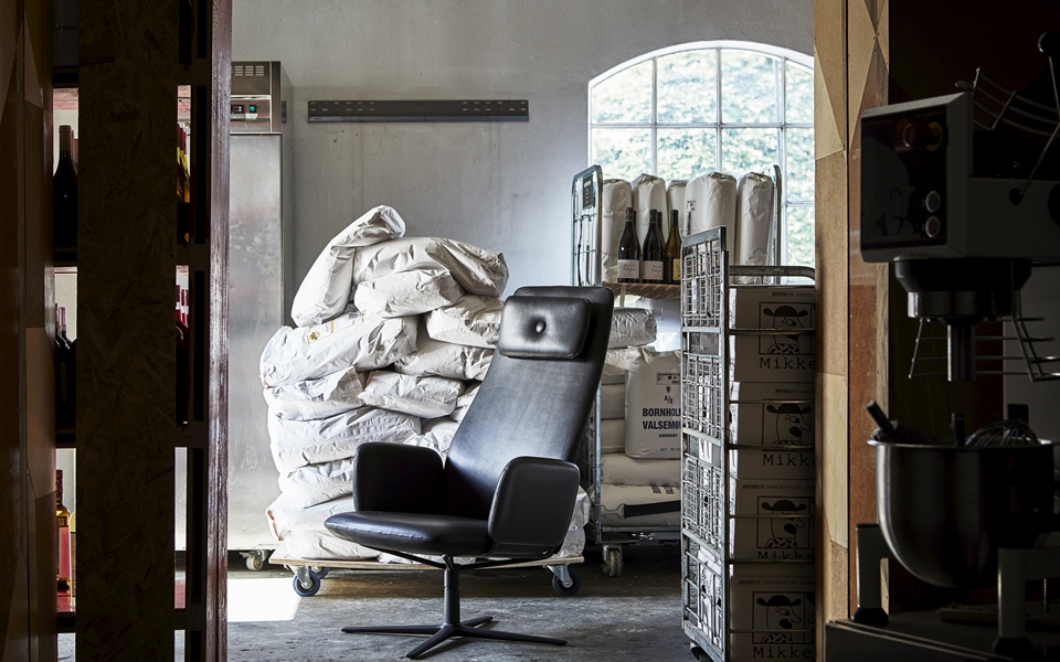 Dundra_Swivel安乐椅。木和钢框架没有流挂的弹簧。