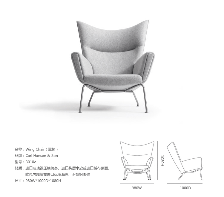 CH445 Wing Chair 是丹麥設計大師 Hans J. Wegner 1960年的設計,當時只見於草圖和少量製作的階段。於2006年由丹麥家具大廠 Carl Hansen & Son 重新生產製作。