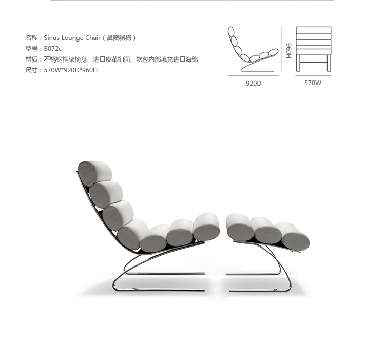 Reinhold Adolf & Hans Jurgen Schropfer为德国著名家具公司Cor设计了一款名为鼻窦系列的家具,这系列家具包括Sinus Lounge Chair(鼻窦躺椅)、Sinus Lounge Ottoman(鼻窦休闲脚踏)及其组合Sinus Lounge Chair and Ottoman(鼻窦躺椅&脚踏)。躺椅造型就像一只只圆形的鼻窦组合在一起,材质是不锈钢框架椅身、进口皮革扪面、软包内部填充进口海绵,躺着上面非常的抒情惬意。