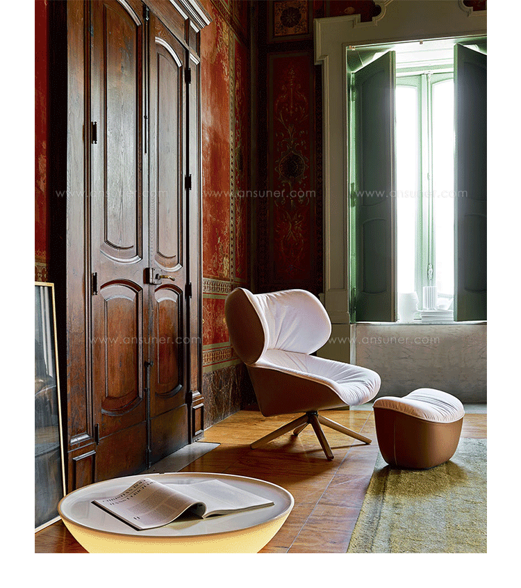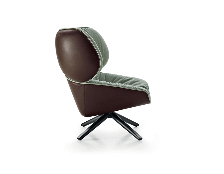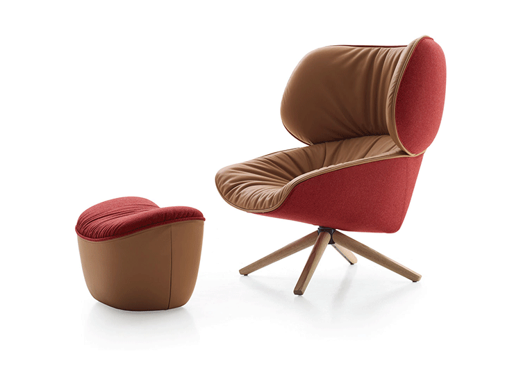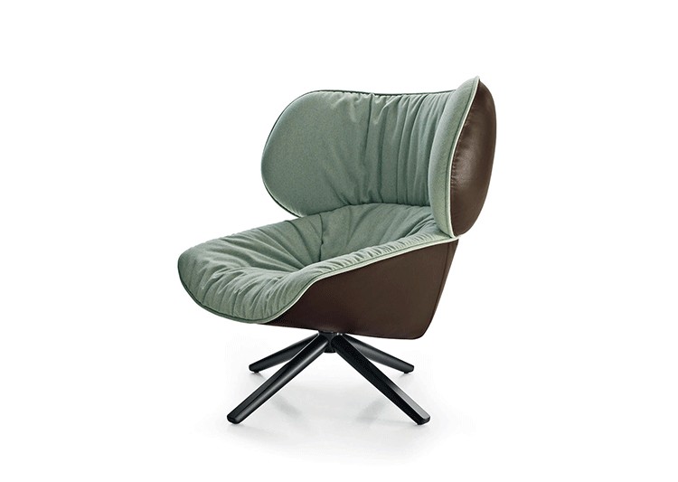 现在可以很明显的看到,追求柔软舒适,一向是Patricia Urquiola的作品中不变的主题。旋转扶手椅Tabano代表着一个重要的阶段,由Husk首次体现这个宣言,其共同特徵是椅背皆插入大型幅条。这也可以说是追求舒适,定义出它的曲线与大容量的椅座与椅背。 大耳朵般的设计来自于满足功能标準上的需求,更甚,这是一种超越美感经验的慰藉。它的外观唤起好奇心,极富表现力,一点都不保守。 对卡通视而不见的揶揄,它同时向大师传承下来的作品,与对先前建立起难以超越的躺椅表示敬意。饰面分别表现出紧緻的外表和轻鬆的内侧。内外侧皆被Tabano完整定义,加入了拉鍊和人造皮革绕起整座外围, 具张力的饰面投射出对比的乐趣。Tabano在黑色聚氨酯旋转底座或橡木(浅、灰色和黑色)有布料或全皮外观,或这两种材料的组合, 脚凳更有椭圆形和其类似座椅的衬里。