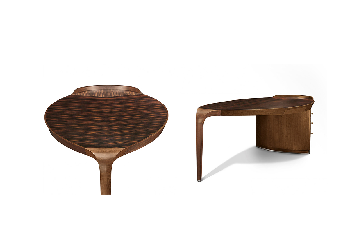 大班台框架,顶部和固体的五斗橱 国家胡桃木单板,可在自然完成,烟草的颜色 完成和黑胡桃木。 腿之间的连接 和腿都在核桃卡纳莱托木与自然完成。