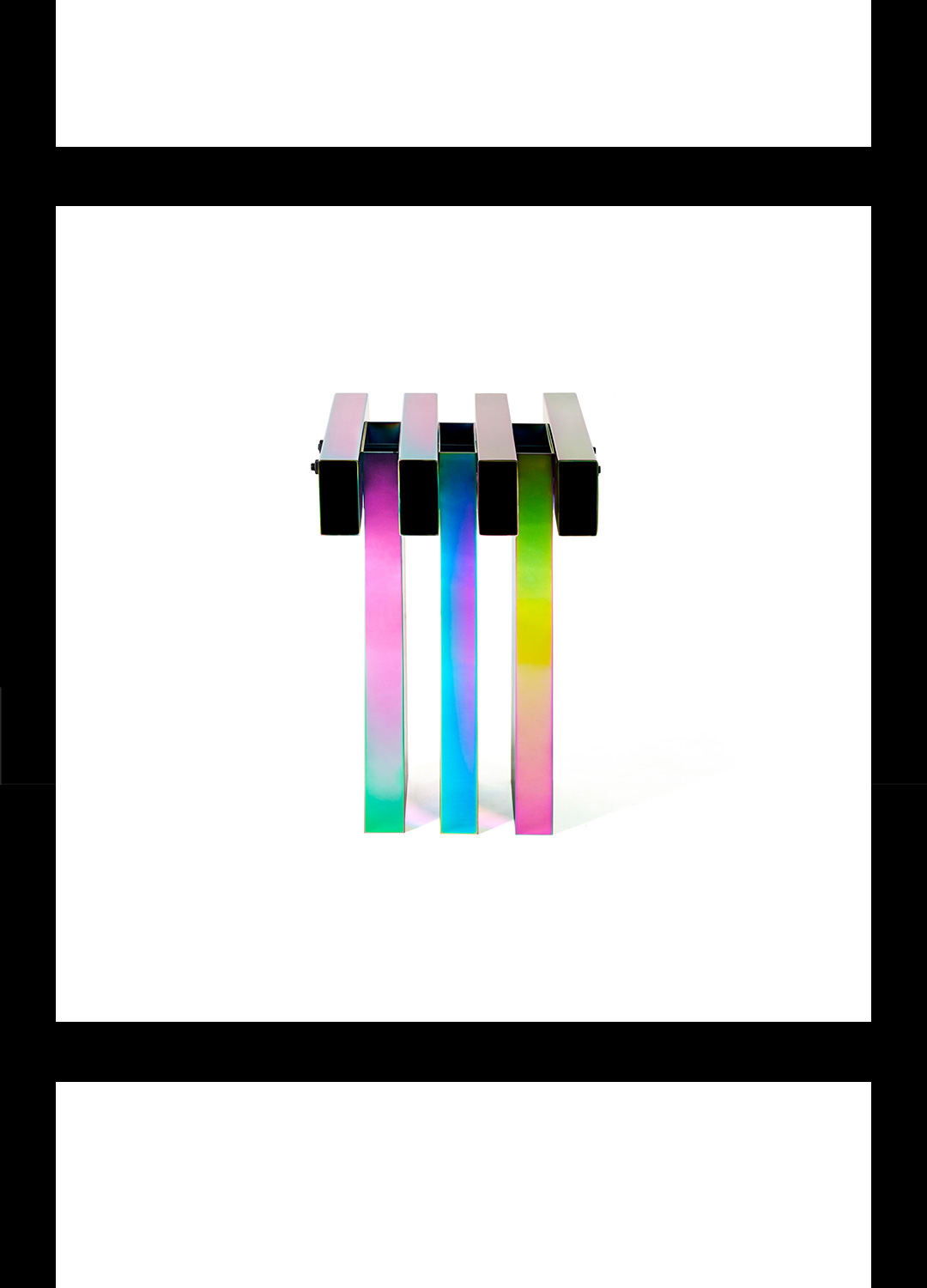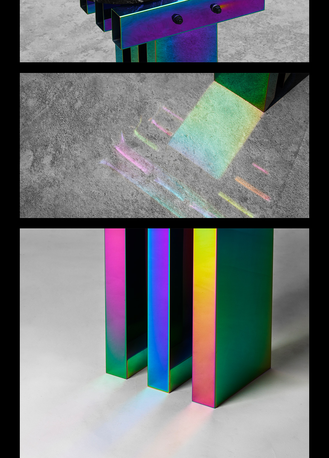 横竖横竖重复的组合方式,是来自草根的语言。常见工地搭台、围板,木方条拼组的,只需一次性的耐用而形成粗暴又稳固的结构方式。 极其炫丽浮夸的幻彩与粗鲁蛮横的草根形式形成反差,产生迷幻、跳脱、超现实的戏剧感受,似乎欲望的幻相,真实得不切实际。