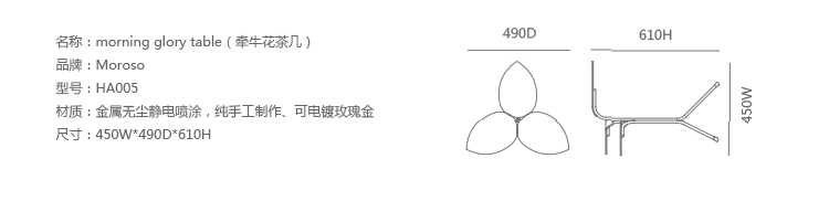 Morning Glory Table(牵牛花茶几)是 Marc Thorpe设计的的作品,金属无尘静电喷涂,纯手工制作、可电镀玫瑰金。牵牛花茶几设计灵感来源于藤蔓植物牵牛花,就像盛开的花朵,“桌如其名”。茶几有三个托盘,并模仿藤自身生长趋势交错布置,交相重叠。