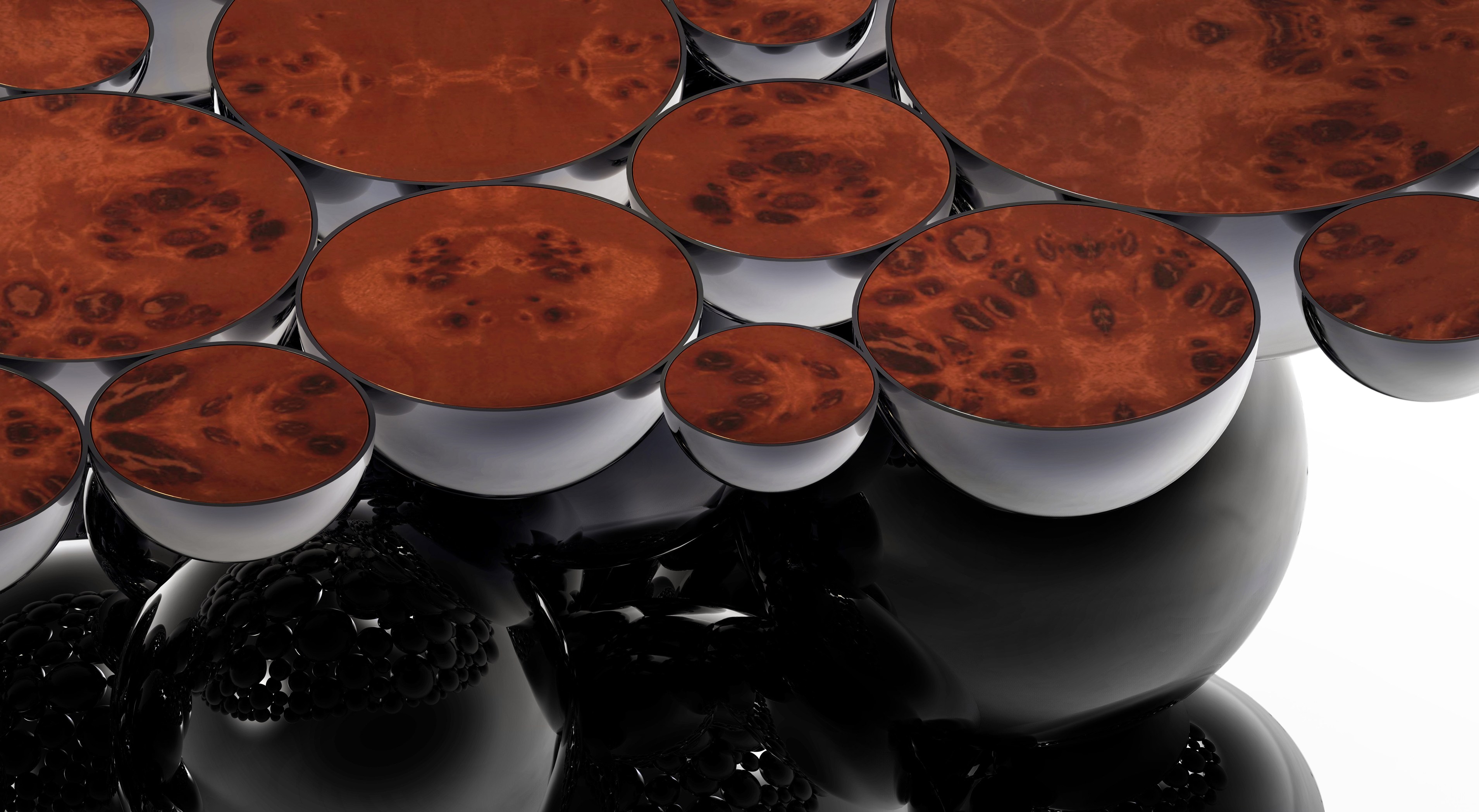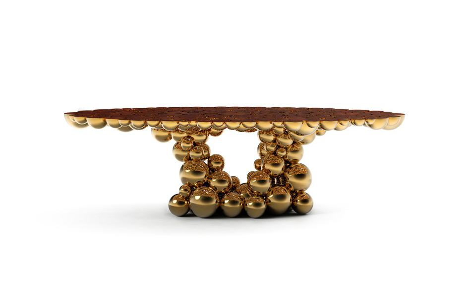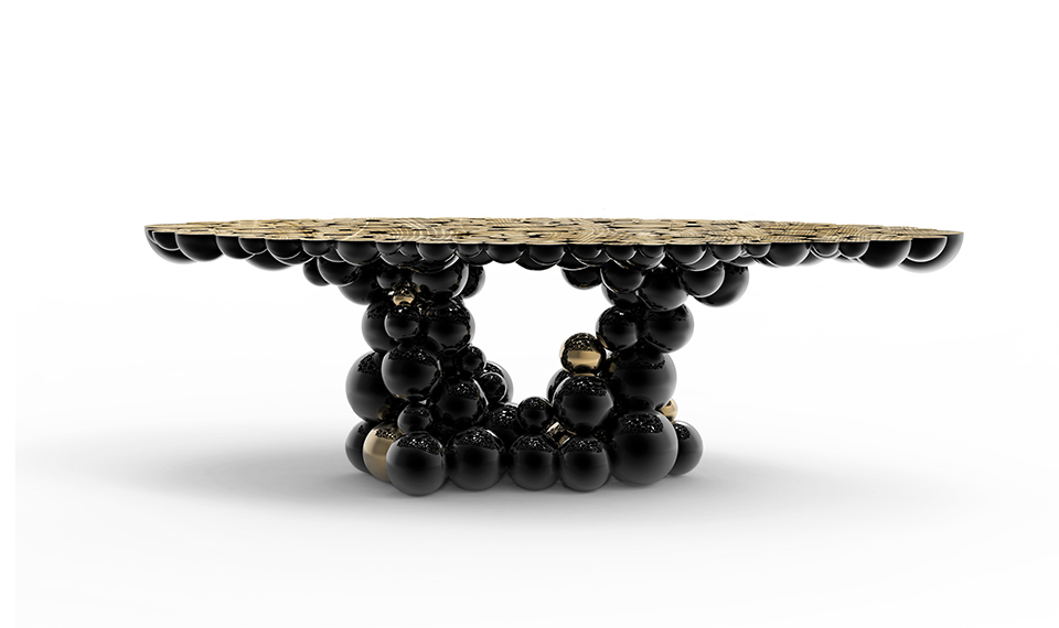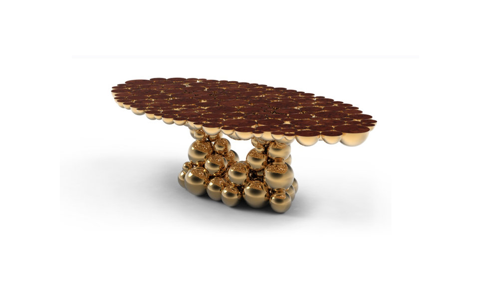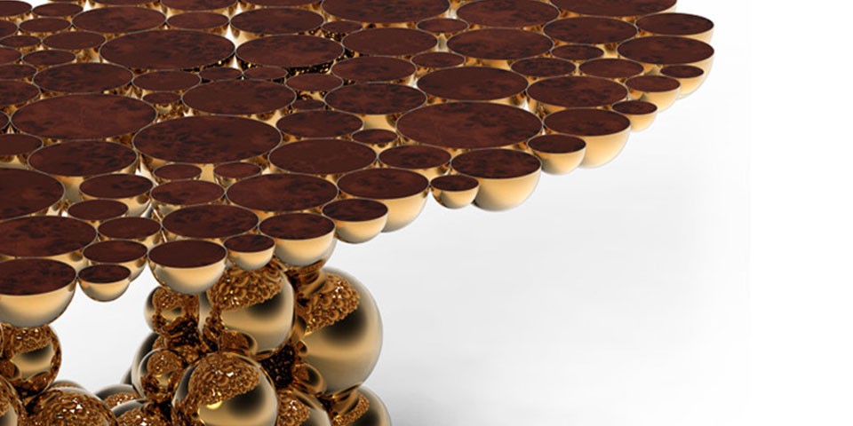 We are still working hard on new challenges for artisans and designers; new techniques, materials and concepts are still being tested now it’s a “MOMENTUM”. Newton is our truly moment of inspiration, a table completed by spheres and semi spheres that joined together complete this dining table with this exquisite look. Inspired in Newton’s law of gravity, we were looking for an object capable to reflect the sphere attraction as they were joined with their mass, force and energy. This table is ideal for 8 to 10 people who will be amazed when gracing this masterpiece at your home. Techniques as casting, lacquering or varnishing, are used in this table, with materials as myrtle burl veneer, walnut root veneer and aluminum. This table has three different versions and all of them present amazing different combinations.