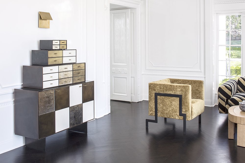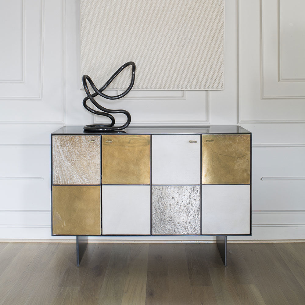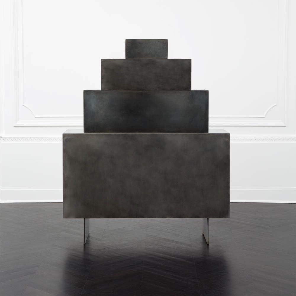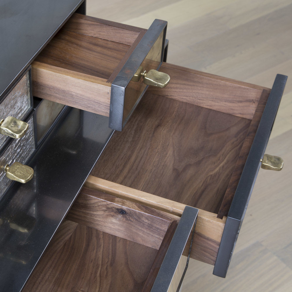 Huntley Cabinet(亨特利柜)是由黑色不锈钢机身和美丽的美国胡桃木内饰组成。在操作台部分的四扇门后面,一个可移动的内部搁架显露出来,而堆叠的金字塔形状以传统燕尾滑动抽屉为特色。 白色羊皮纸,手工制作的透明种子玻璃,古董镜子和抛光青铜,抽屉和门前面交替,全部装饰有手工雕刻的拉链。