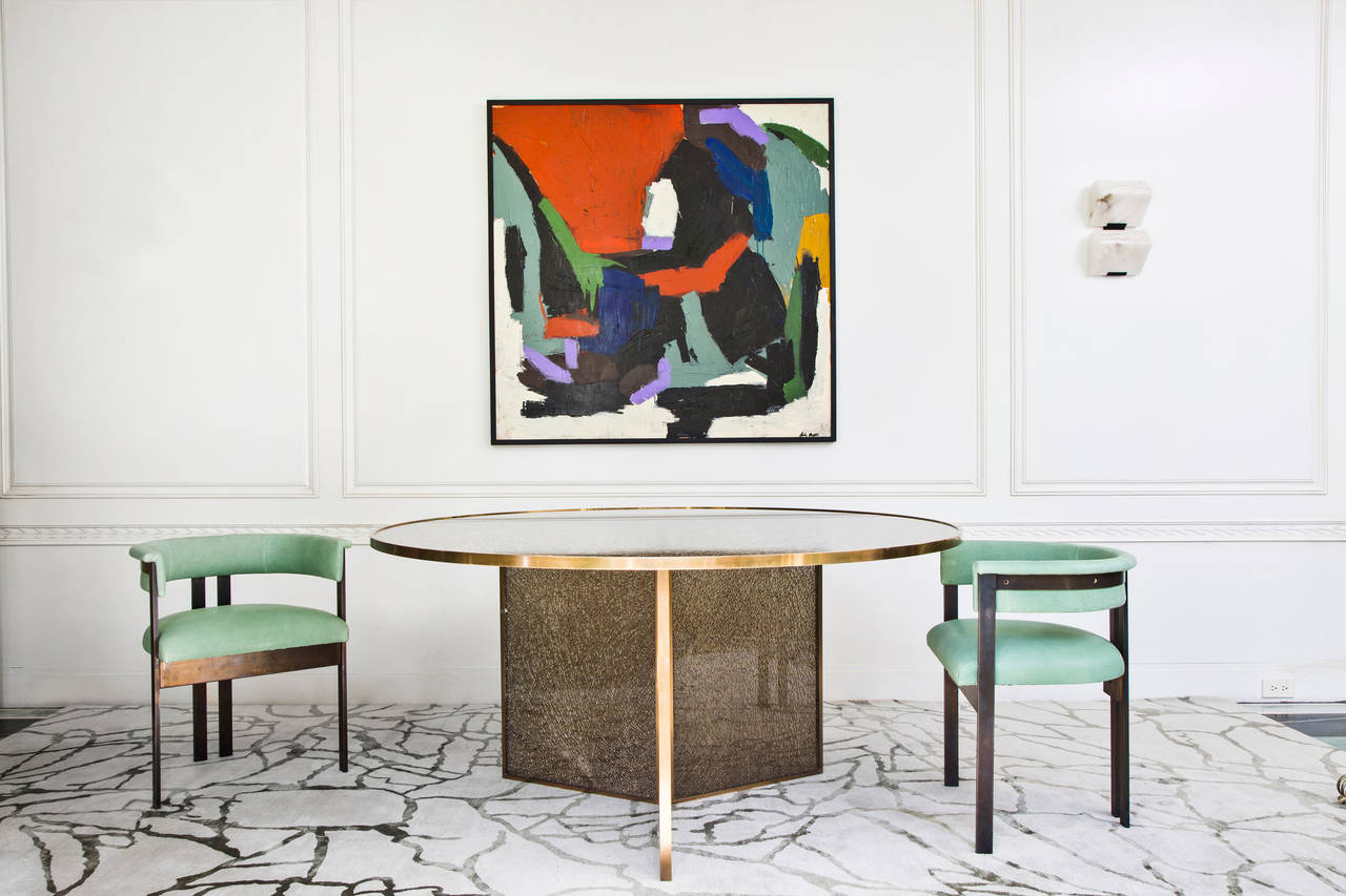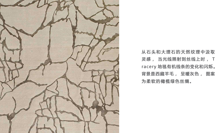 从石头和大理石的天然纹理中汲取灵感,当光线照射到丝线上时,Tracery地毯有机线条的变化和闪烁。 背景是西藏羊毛,呈暖灰色,图案为柔软的橄榄绿色丝绸。