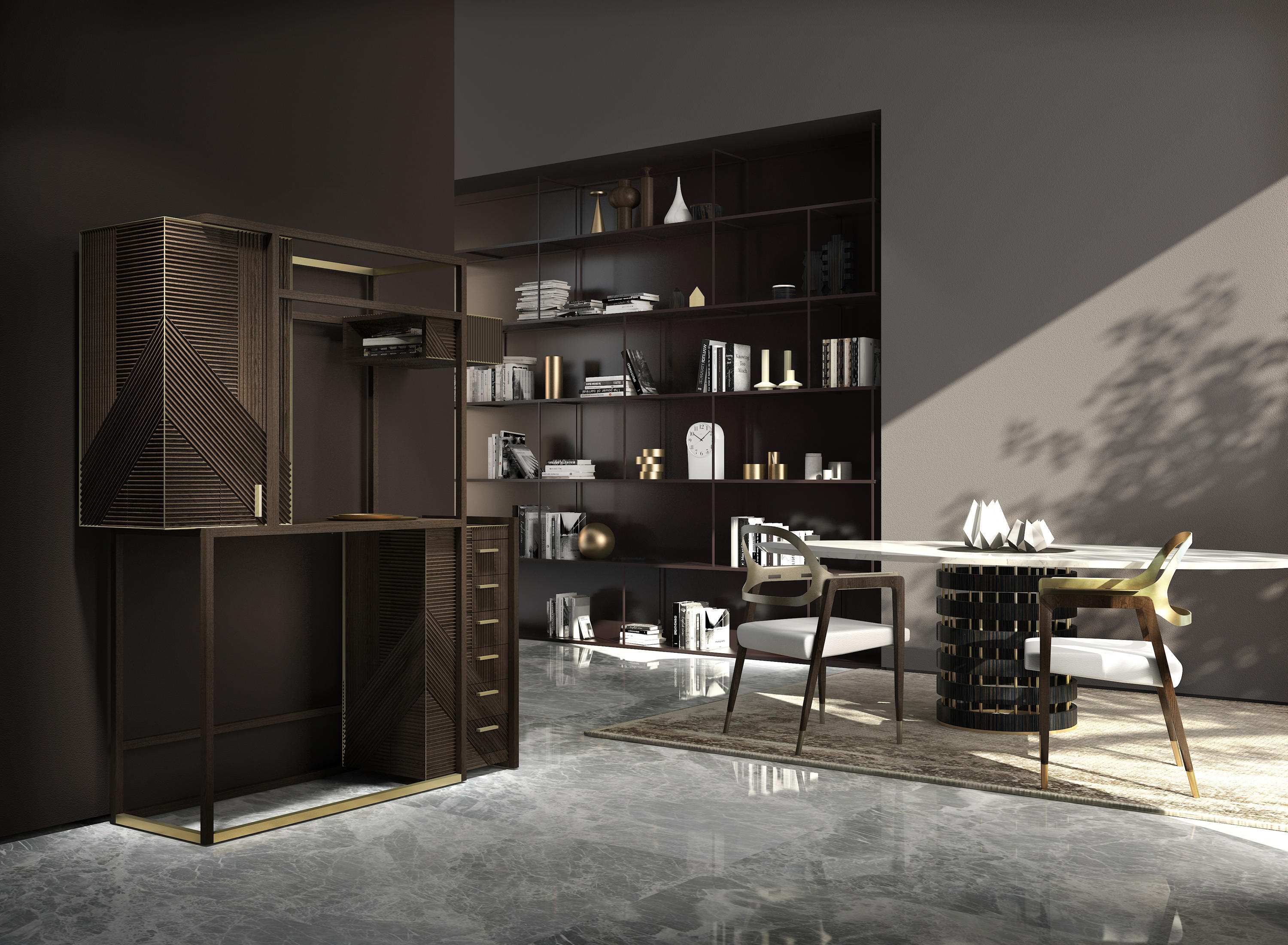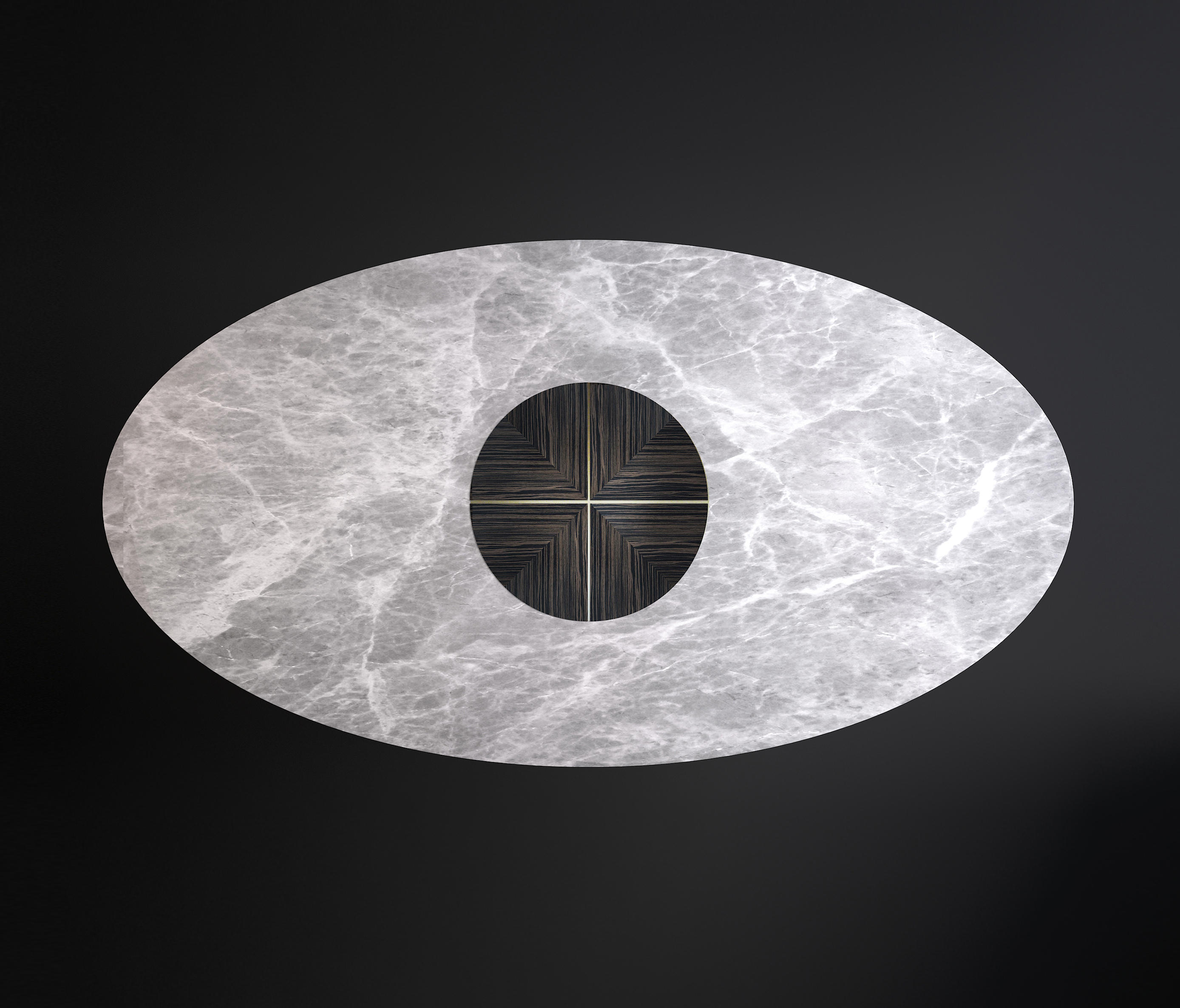 华丽华丽的桌子;木质结构支撑着椭圆形的灰色大理石桌面。同样的装饰让人想起顶部的图案,薄薄的黄铜条交织在一起,呈现出不同寻常的优雅。实体空间和空洞空间的交替与顶部的坚固性相矛盾,确实带来了意想不到的轻盈感。
