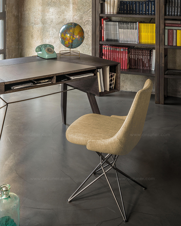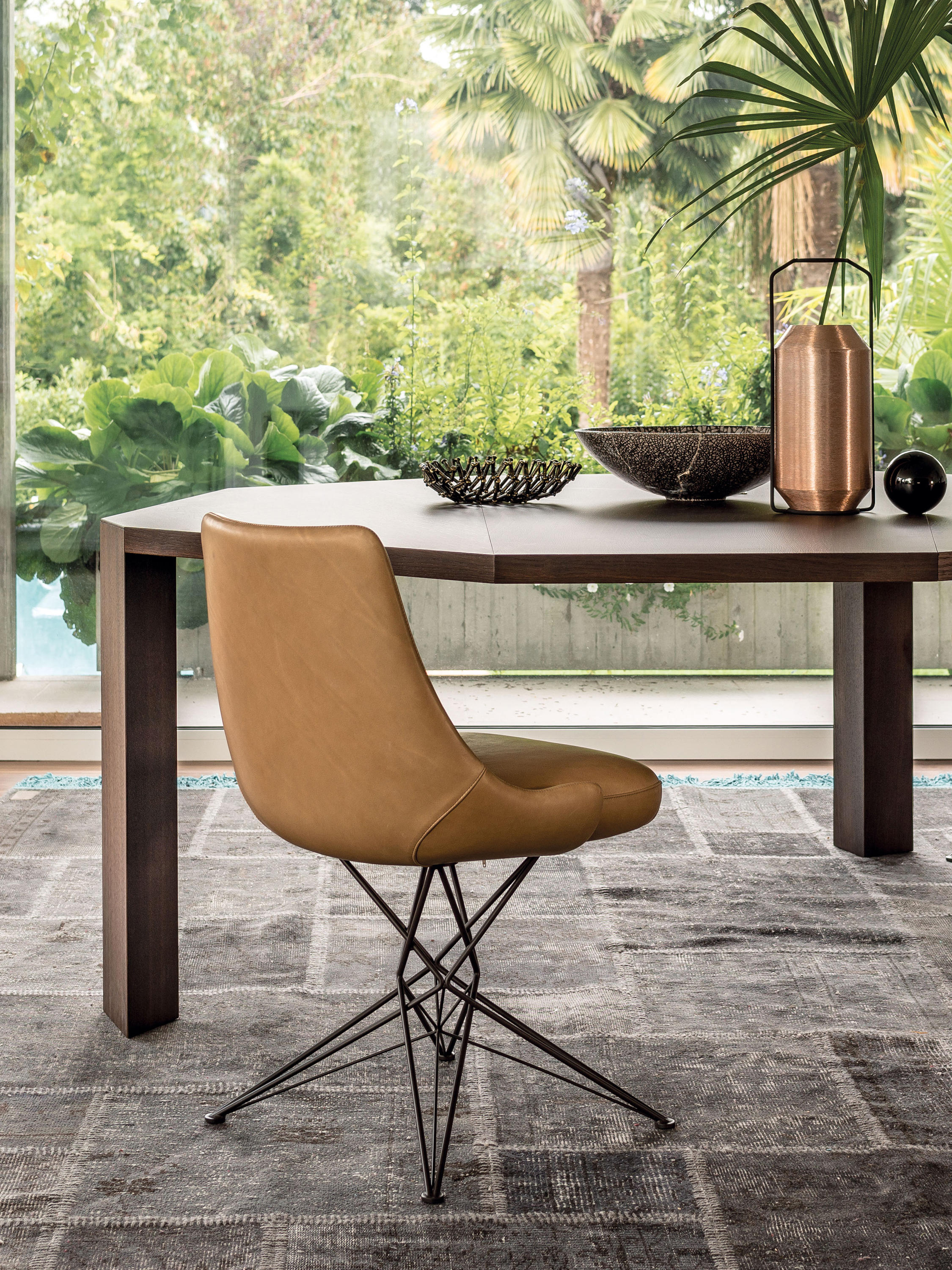 由金属丝制成的轻盈而立体腿部与座椅靠背的结构形成对比,从而在形状和体积之间营造出一种和谐的平衡效果。座椅靠背略微弯曲,将座椅的衬垫包裹起来,以符合人体工程学和动态舒适性。