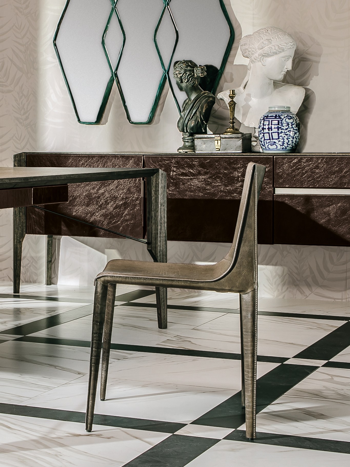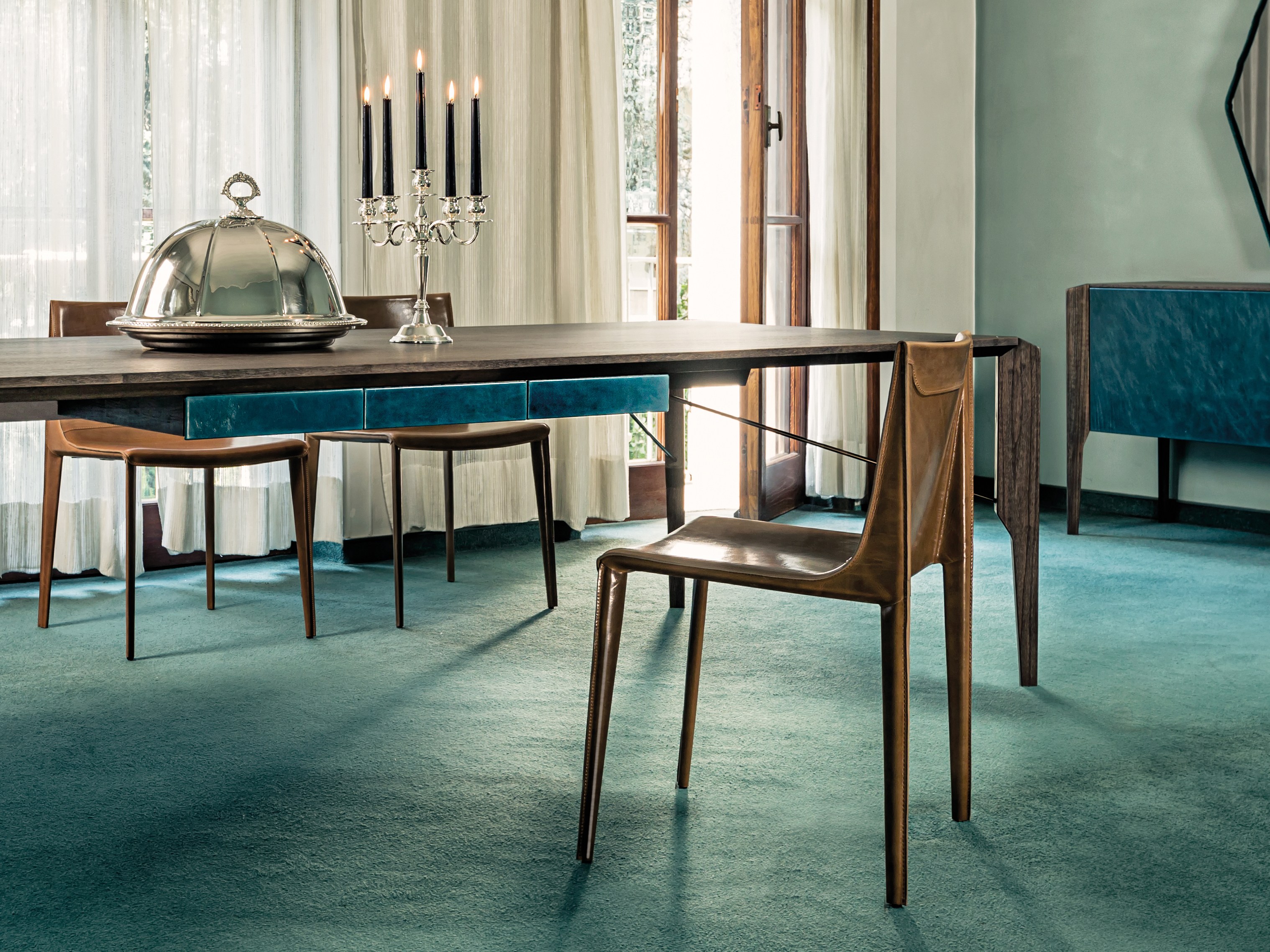 Manzoni & Tapinassi设计的椅子有严格的几何特征,它有一个宽大的座椅和一个较低的靠背,可以用皮革或植物鞣皮革饰面。