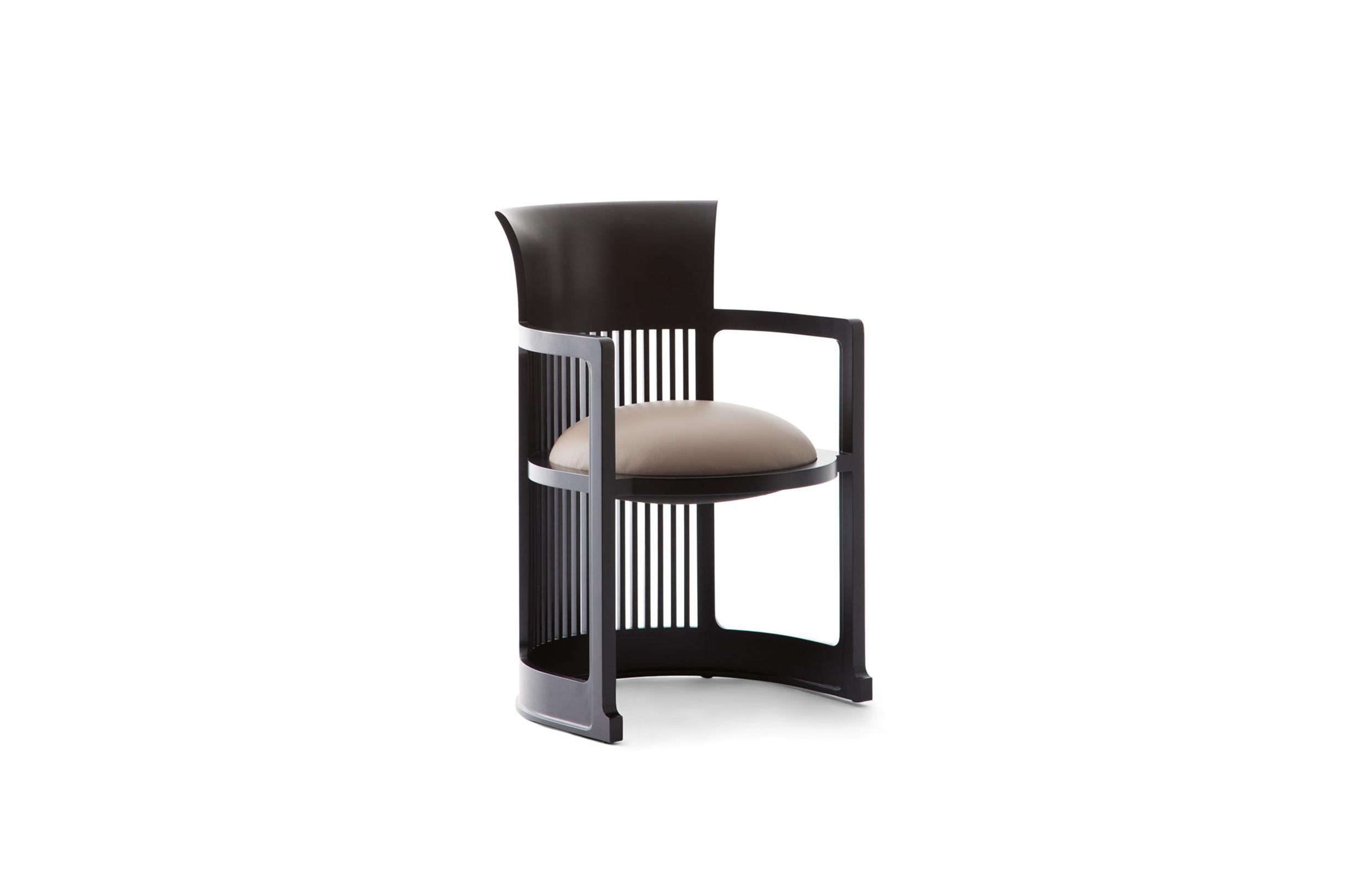曲背餐椅,采用天然樱桃木、樱桃木色或黑色的胡桃木制造。塑料座面采用聚氨酯海绵和喷胶棉填充。座面软包为皮革或布艺面料。