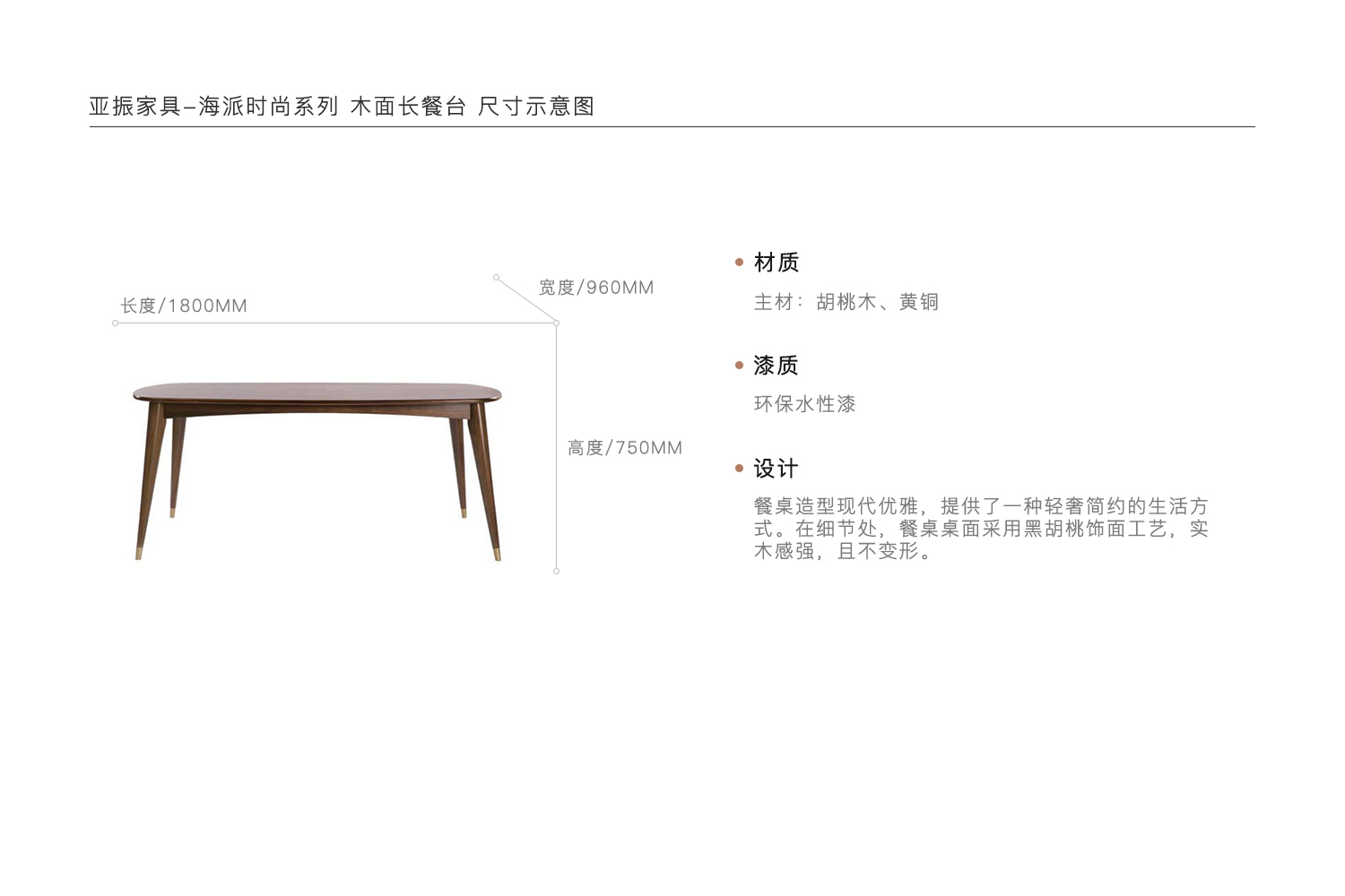 餐桌造型现代优雅,提供了一种轻奢简约的生活方式。在细节处,餐桌桌面采用黑胡桃饰面工艺,实木感强,且不变形。