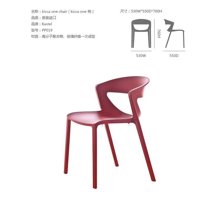 Kastel是一个在室内装饰领域极具影响力的公司,该公司具备高水平的综合生产能力,是一个充满活力的公司。Kastel公司产品多种多样,包括办公座椅,社区座椅和家庭座椅等等。Kastel在对人体工程学进行深刻研究之后,制定了现在的生产线,产品的设计以舒适为主,在生产过程中每一步都严格遵循这一宗旨,为客户提供高性能的产品,满足客户对舒适的基本要求。这也是Kastel公司的经营理念。kicca one chair(kicca one 椅)制作选材为高分子聚合物(聚丙烯),玻璃纤维一次成型,颜色可选白色、灰色、绿色、熔岩色等,可以堆叠,节省空间,且与其他家居搭配非常完美和谐,集艺术性与功能性为一体,可以用在户外,也可以用在餐厅等环境。