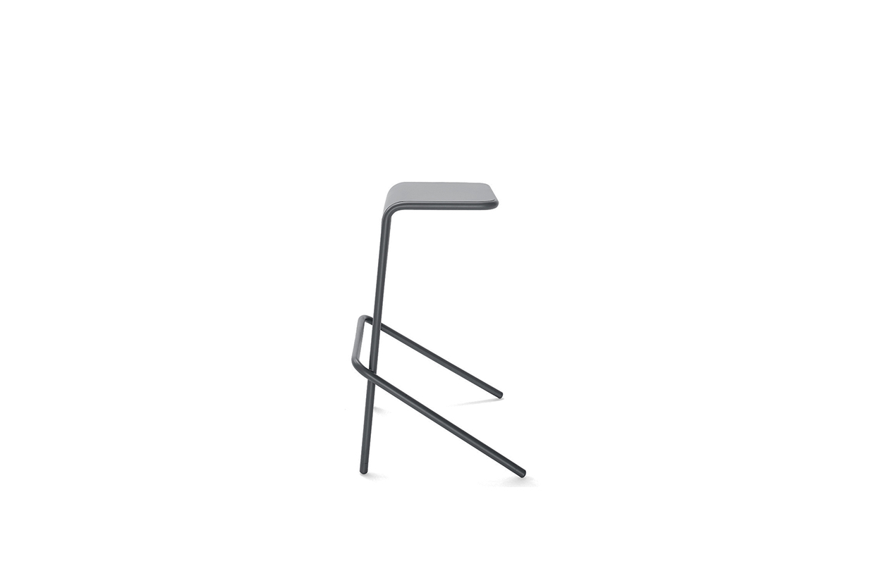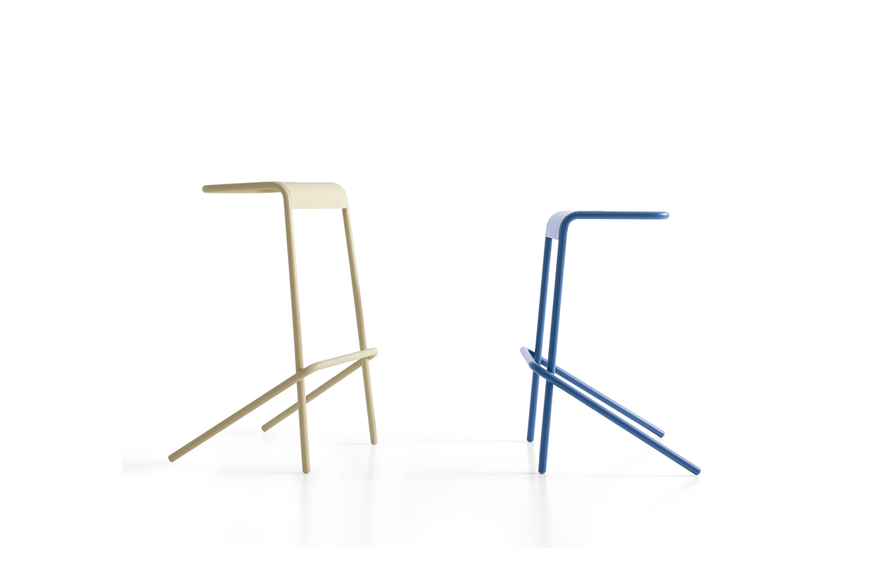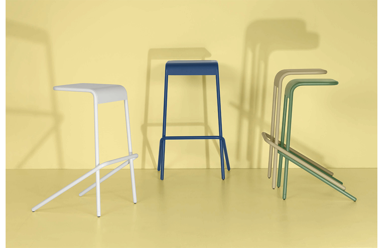 折叠凳的金属管和钢片创建,座激光切割,在黑色的塑料脚。可在两个高度,它提供了马特油漆芥末,蓝色,绿色,白色和无烟煤的颜色.