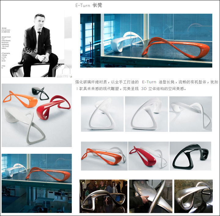 澳大利亚年轻设计师BrodieNeill所带来的家具设计在保持独特美观的基础上兼顾实用,从而得到了纽约以及伦敦各知名家具品牌的青睐。近日,他所设计推出的新系列———“E-Turn”椅子在纽约著名时尚地RubinChapelle与人们见面。