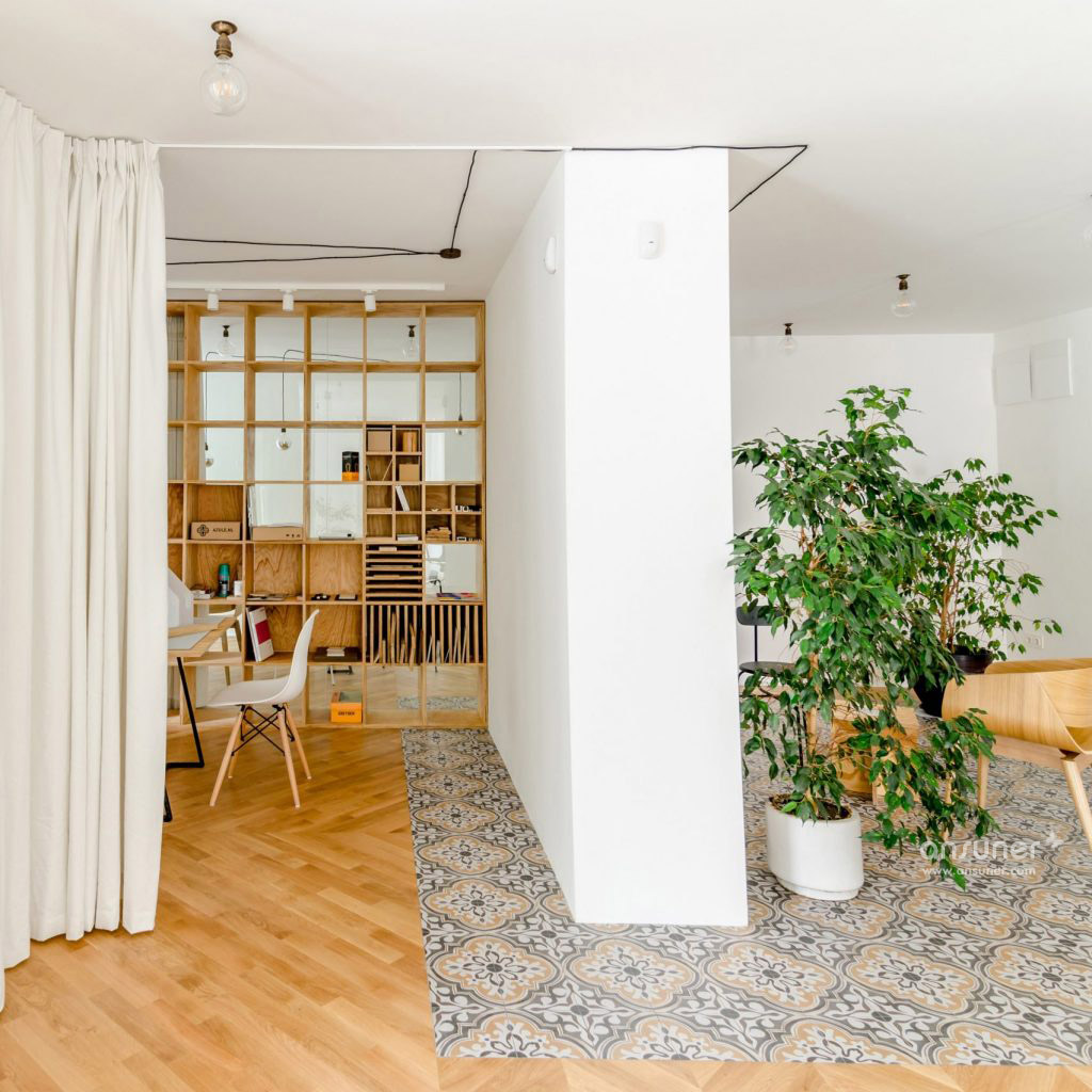 工作室包括两个主要工作区域,一个物理建模空间,一个会议室,一个厨房,一个浴室和两个露台。胶合板书架双重作为家具,使房间尽可能节省空间。在会议室和建筑空间之间,书柜可根据需要设置可拆卸元件,形成座位和侧桌,分离厨房和工作室空间的单元有一个内置的衣架。地板区分了房间,从各种布置的橡木地板到装饰瓷砖。 这些瓷砖意图类似于分散在太空中的地毯,营造出温馨的氛围。