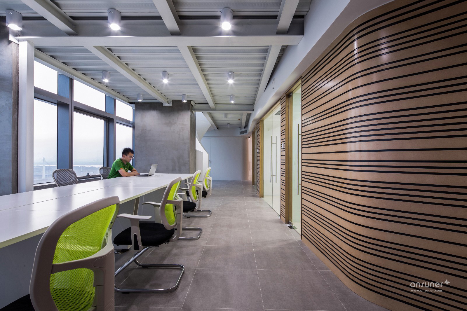 步入公司大门整个前台区以一种不规则的形态呈现在你的眼前,远角处经由一个廊口连接一层办公区域,设计师的故意为之让办公区不但具备很好的私密性,同时也保证了整个办公区不受外界干扰。沿着墙面蜿蜒的线条走进去,瞬间感觉豁然开朗,访客则会产生“别有洞天”的感受。楼梯间与公司唯一的8人员工区一起被放置在靠近窗户一侧,设计师还刻意保留了隔层的原始结构,以拉升空间高度,使公共办公区域得到有效增容,这样一来无论是在办公室里面还是员工区,都能轻松一览窗外美景。另外设计保留所有主体立柱以清水混凝土的外表体现,一丝工业风也油然而生。
